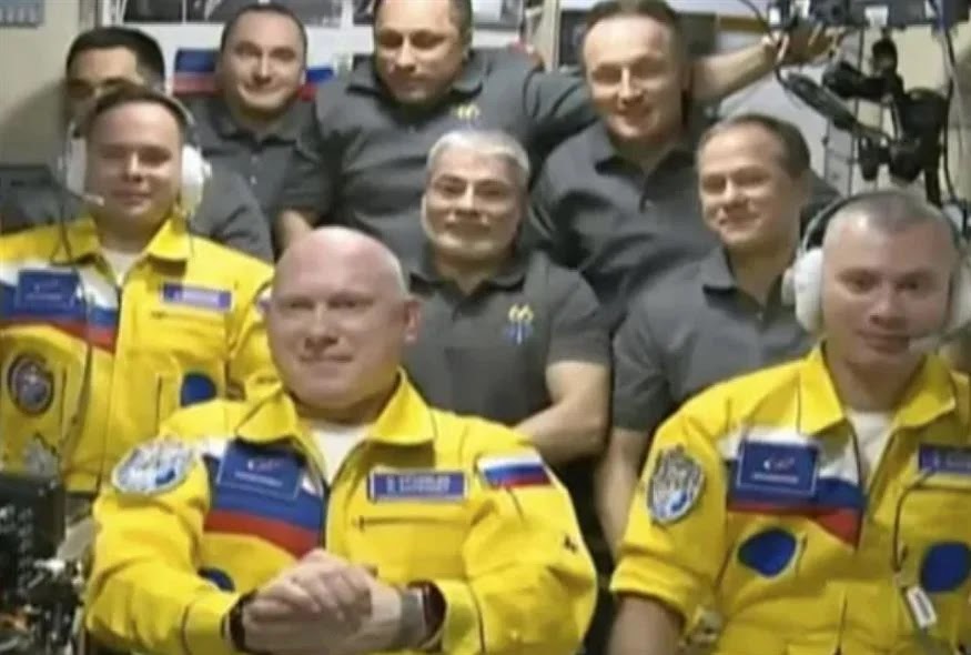Ρώσοι κοσμοναύτες έφτασαν στο Διεθνή Διαστημικό Σταθμό φορώντας κίτρινες στολές με μπλε πινελιές, τα χρώματα της Ουκρανικής σημαίας.